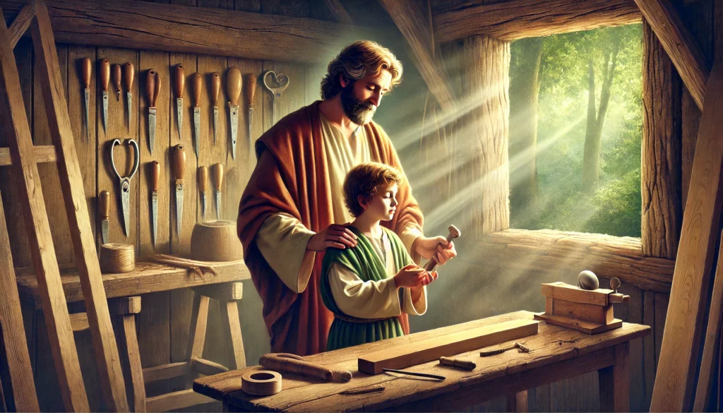 San José, descrito en los evangelios como “hombre justo”, fue elegido por Dios para ser el custodio de Jesús y María. Su papel como carpintero y su vida de trabajo arduo reflejan la dignidad del trabajo humano y el compromiso con la familia.